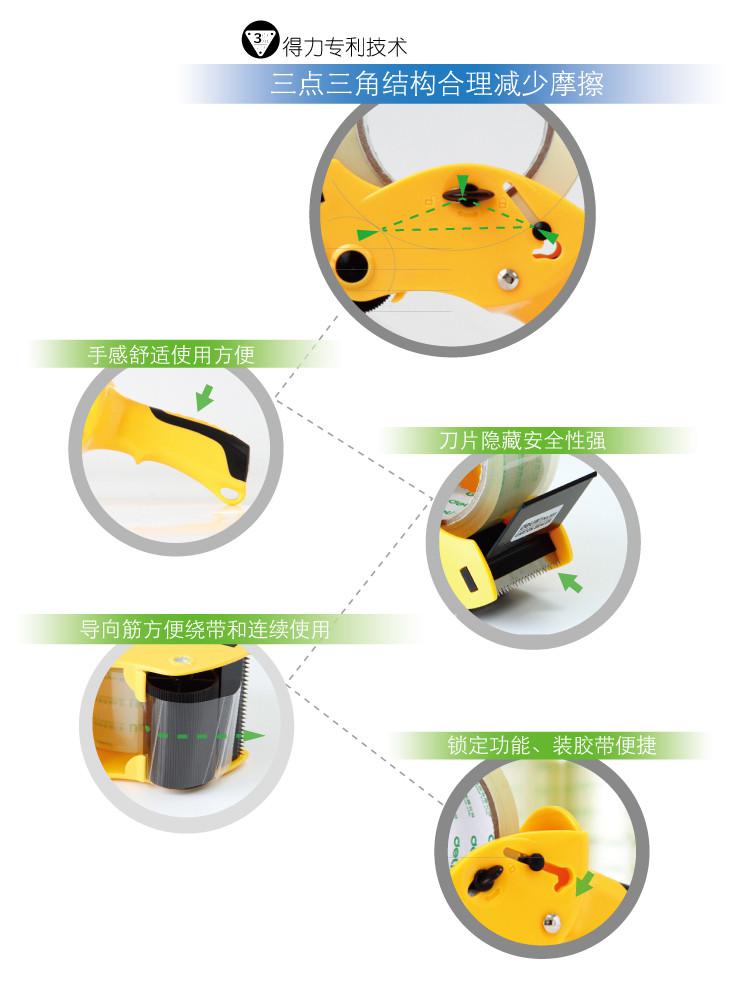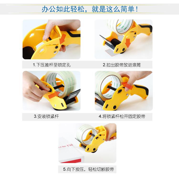 詳細使用說明:1.將推桿下壓,至推桿進入鎖定孔位置;2.將膠帶頭先拉出適當長度,放到滾筒下面;3.將鎖緊桿裝入對應(yīng)的孔中,旋轉(zhuǎn)鎖緊桿180度,至鎖住位置;4.將鎖緊桿推出鎖定孔,將自動穩(wěn)定膠帶;5.封鎖紙箱,輕松一壓便切斷膠帶。